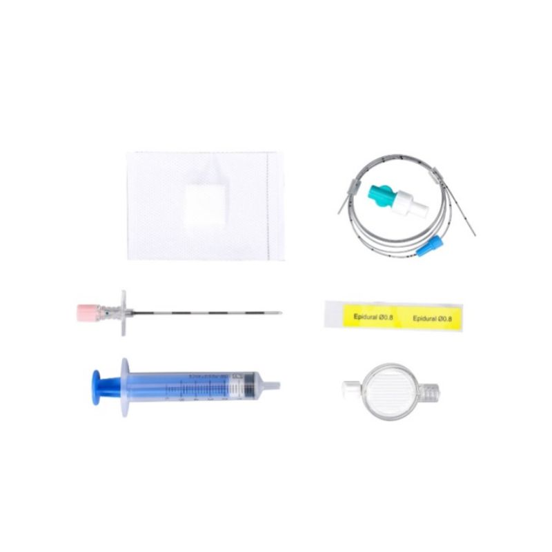 硬膜外麻酔キットは、硬膜外針、硬膜外カテーテル(一般タイプまたは強化タイプ)、導入針、導入ガイド、カテーテルコネクタ、液体フィルター、低抵抗シリンジで構成されています。硬膜外穿刺や、硬膜外麻酔中の硬膜外腔への液体薬剤の注入に使用されます。